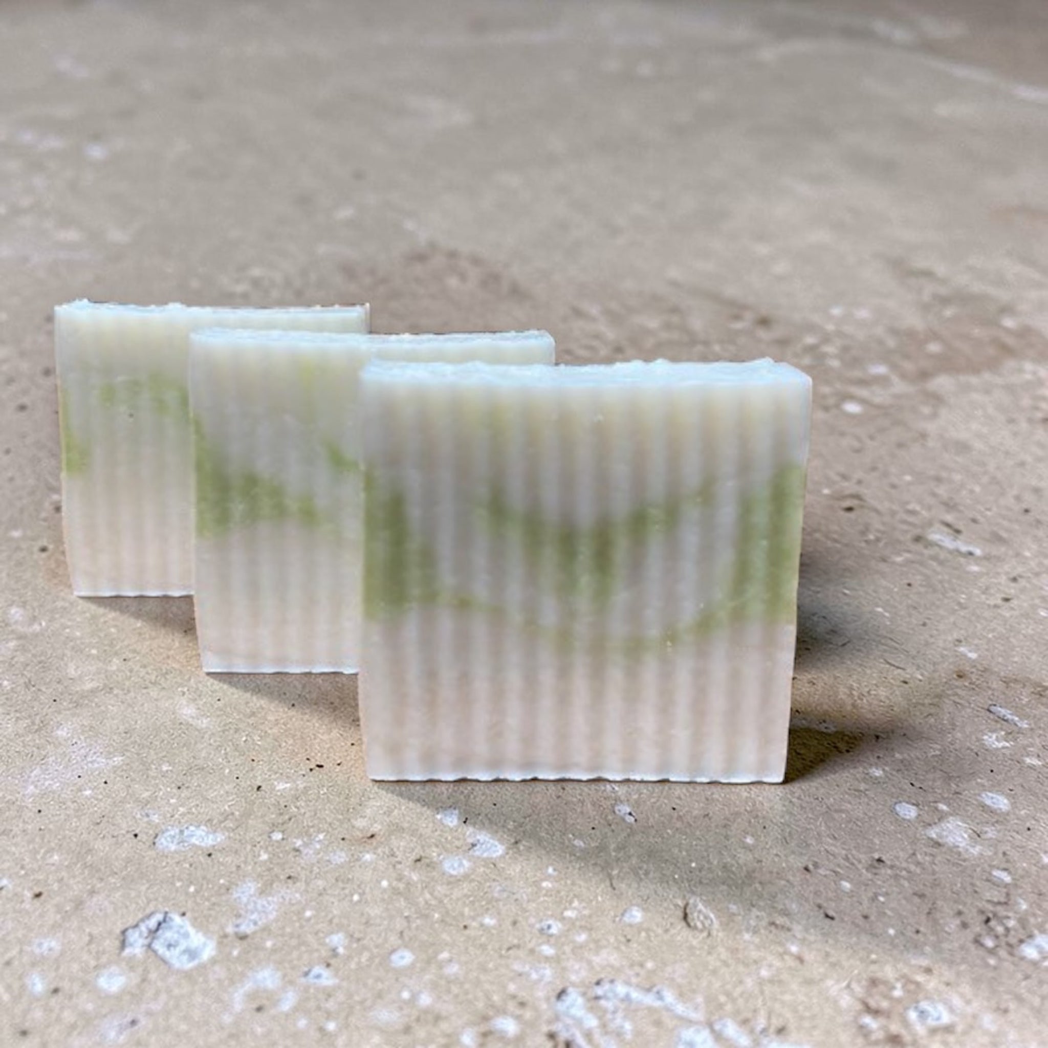 The translucent base is enriched with shea butter for a creamy, skin-soft feel. A subtle ribbon of natural spinach powder moves through each bar, adding a muted green tone that reflects the calm, layered character of the scent.