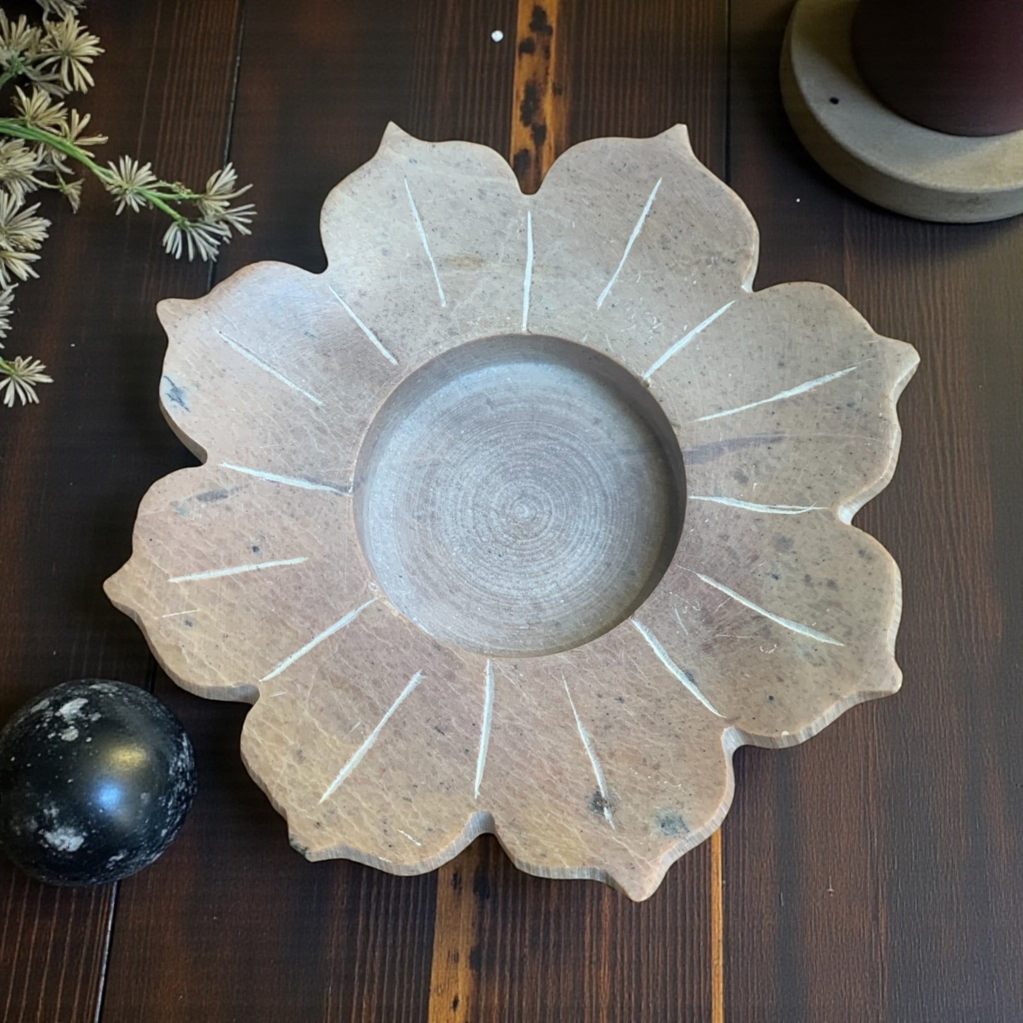 This lotus-shaped natural Stone Incense Tealight Holder is designed for use with charcoal, incense cones, and tealights. Since these are made from natural stone, each one will be slightly different however the hue is grey with beige tones.