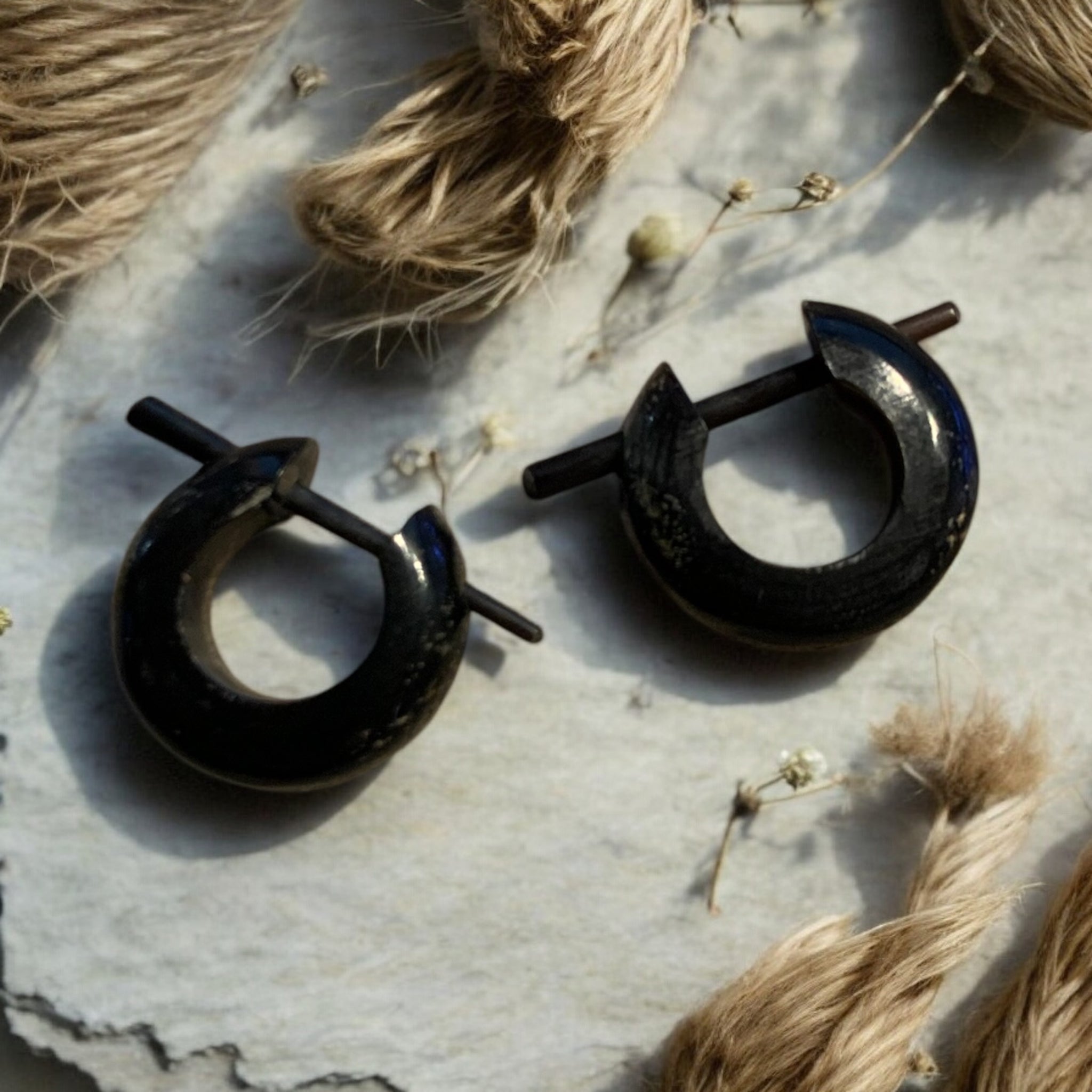 These Thimble Hoop Wood Post Earrings are hand-carved from salvaged horn, celebrating the quiet beauty of natural variation. Subtle shifts in tone and organic patterning come directly from the horn itself, no dyes or artificial coloring, making each pair distinctly one of a kind. Thoughtfully repurposed from domesticated water buffalo raised for cultivation, the material is transformed into timeless wearable art that honors sustainability and craft.